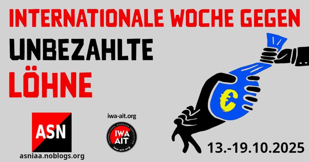 Das Anarcho-Syndikalistische Netzwerk beteiligt sich an der „Aktionswoche gegen unbezahlte Löhne“ der Internationalen Arbeiter*innen-Assoziation (IAA), die dieses Jahr vom 13.-19-10.2025 stattfindet.